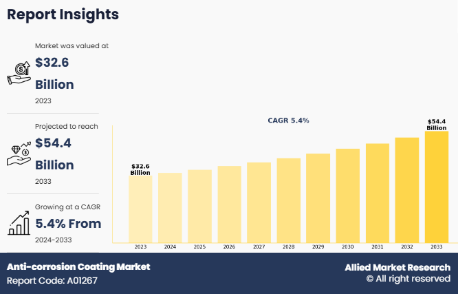 WILMINGTON, DE, UNITED STATES, October 23, 2025 /EINPresswire.com/ -- Allied Market Research published a report, titled, "Anti-corrosion Coating Market by Type (Epoxy, Polyurethane, Acrylic, Alkyd, Zinc, Chlorinated Rubber, and Others), Technology (Solvent-Borne, Waterborne, Powder Coating, and Others), and End-Use Industry (Marine, Oil and Gas, Industrial, Construction, Energy, Automotive, and Others): Global Opportunity Analysis and Industry Forecast, 2024-2033". According to the report, the anti-corrosion coating market was valued at $32.6 billion in 2023, and is estimated to reach $54.4 billion by 2033, growing at a CAGR of 5.4% from 2024 to 2033.